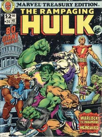 Marvel Treasury Edition (1974) #24 features the Rampaging Hulk. This issue features "Man-Brute in the Hidden Land" (Reprints Incredible Hulk #175) by Roy Thomas, Herb Trimpe, and Jack Abel, "Crisis on Counter Earth" (Reprints Incredible Hulk #176) by Gerry Conway, Herb Trimpe, and Jack Abel, "Peril Of the Plural Planet" (Reprints Incredible Hulk #177) by Gerry Conway, Herb Trimpe, and Jack Abel, and "Triumph of Terra-Two" (Reprints Incredible Hulk #178) by Gerry Conway, Tony Isabella, Herb Trimpe, and Jack Abel. Guest-starring the Inhumans and Adam Warlock. Plus, a solo adventure featuring Hercules by Mary Jo Duffy and Ricardo Villamointe.