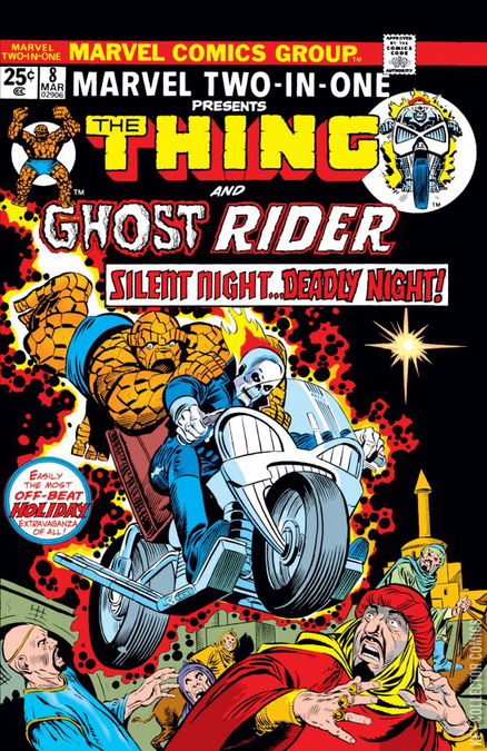 Ghost Rider rides through a dark Arizona desert on Christmas Eve, 1974, only to come across... three wise men on camels. The wise men tell GR that they're three kings following a blazing star seeking the child of prophecy. Johnny Blaze (Ghost Rider) is a mite puzzled, and decides to investigate, leaving the men and their camels behind him. In the Baxter Building, Ben is helping out Reed (Mr. Fantastic), in his lab, and griping about Reed's working even on Christmas Eve. Reed is fascinated by the new star. Ben heads downstairs, and join the FF's Christmas party, where pretty much the whole guest list above excepting Wyatt (but plus Alicia Masters and Annie Christopher, Namorita's roommate) is enjoying the holiday. They activate Reed's XMas surprise, and discover that his Christmas tree decorating pretty much outdoes the fourth of July, much to Ben's amusement. Back in Arizona, Ghost Rider has made it to a middle eastern city, populated by American Indians in semitic clothing. We recognize (though GR doesn't) the innkeeper as Wyatt Wingfoot, and GR is driven away from the manger by a mysterious dark figure who creates a whirlwind out of thin air. Meanwhile, Ben has gone back up to get Reed, who's figured out that something is up in Arizona. Reed wants to head out to investigate, but Ben forces him to go down and join his wife and son at the party, and heads out to investigate the mystery in Arizona himself. Arriving in Arizona, Ben sees a flare burning on a hill, and heads for it. The 'flare' is actually Ghost Rider, and after introductons, the two commandeer some camels and clothes and head for town...