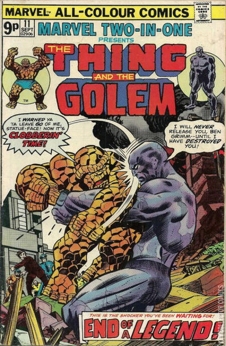 The cover blurb says "End Of A Legend!" but the splash page has the title "The Thing Goes South." Ben Grimm uses his super strength to hold up a train he and girlfriend Alicia Masters have to catch to get to Disneyworld. Using his powers in this way makes The Thing shunned by the people on the train- he is treated like a monster once again.Meanwhile at San Pedro University THE GOLEM is under examination by a team led by by Professor Yeates. The Golem has protected Yeates and his team from demonic attack several times. The Golem is discovered to activate due to love- when people it loves are in danger, it comes to life. Otherwise it is a lifeless statue. All of this discovery is monitored in the netherworlds by the demon leader Kaballa.Back on the train, Ben hears on the radio that a tidal wave has flooded part of St. Petersburg. He also hears that the water is preventing rescue crews from reaching San Pedro University.Ben jumps from the train with Alicia so he can help in the crisis. The Thing encounters the Golem. After the obligatory slugfest the real villain is revealed to be the demon Kaballa and after another slugfest the demon flees rather than face the Golem alone.