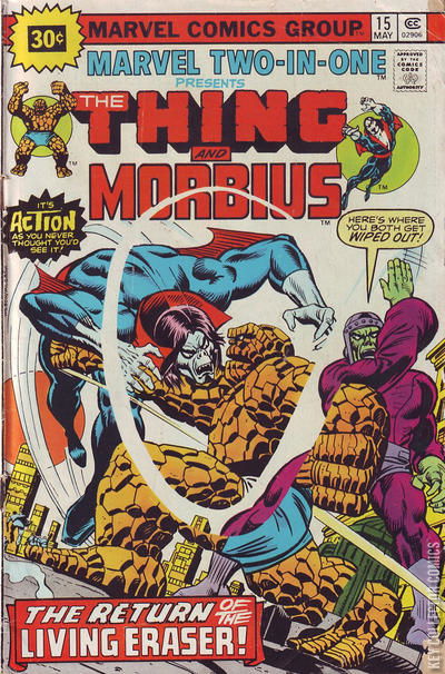 The Thing and Morbius fight the Living Eraser and defeat him. Alicia Masters is working in her studio late at night on a bust of Ben. Through the skylight, silhouetted against the moon, we see... Morbius, the Living Vampire. Morbius sneaks in, and Alicia screams. Ben is just down the hall, coming up with a bouquet of flowers, and crashes to the rescue. After a quick tussle, Morbius flees (Alicia begging Ben to help him, not hurt him). Not far away, we see the Living Eraser emerge into our dimension, and erase some poor wino who just happened to be there. The Living Eraser is one of those super-villains who talks to himself, apparently, and he recites his origin story there in the alley. About the time he finishes, a hungry Morbius swoops in from behind him for dinner. Ben hears the yells, and drops from Alicia's window to the fight below. As Morbius and Ben exchange blows, the Living Eraser gets up and 'erases' both of them into another dimension. Realizing things have changed more than slightly, Ben and Morbius cease fighting, and begin working together to try to figure out what to do now...