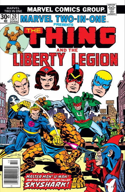 The Thing completes his mission of going into the past to grab some vibranium from the Axis Power. While in the past, he gets help from the Liberty Legion. Its the 1940s, and Ben has flung himself into the air at a flying Nazi swastika that is circling over New York City. Manning, if that's the correct term, the swastika is Brain Drain, a disembodied human brain. With his hypnotic abilities, he makes Ben tell him where he came from and how he got to be there, recapping MTIO Annual 1 for us. With the recital over, Ben regains his freedom of movement, and proceeds to tear into the swastika. As Ben tears into it, Brain Drain retreats, carrying both of them to the secret Nazi base at sea. As they land gently, Ben looks around to find the other three Nazi villains there: Skyshark, Master Man, and U-Man. An all-out fight follows, and things are finally starting to not go too well for Ben when the Liberty Legion arrive in the Thin Man's plane...