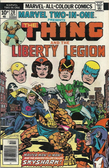 The Thing completes his mission of going into the past to grab some vibranium from the Axis Power. While in the past, he gets help from the Liberty Legion. Its the 1940s, and Ben has flung himself into the air at a flying Nazi swastika that is circling over New York City. Manning, if that's the correct term, the swastika is Brain Drain, a disembodied human brain. With his hypnotic abilities, he makes Ben tell him where he came from and how he got to be there, recapping MTIO Annual 1 for us. With the recital over, Ben regains his freedom of movement, and proceeds to tear into the swastika. As Ben tears into it, Brain Drain retreats, carrying both of them to the secret Nazi base at sea. As they land gently, Ben looks around to find the other three Nazi villains there: Skyshark, Master Man, and U-Man. An all-out fight follows, and things are finally starting to not go too well for Ben when the Liberty Legion arrive in the Thin Man's plane...