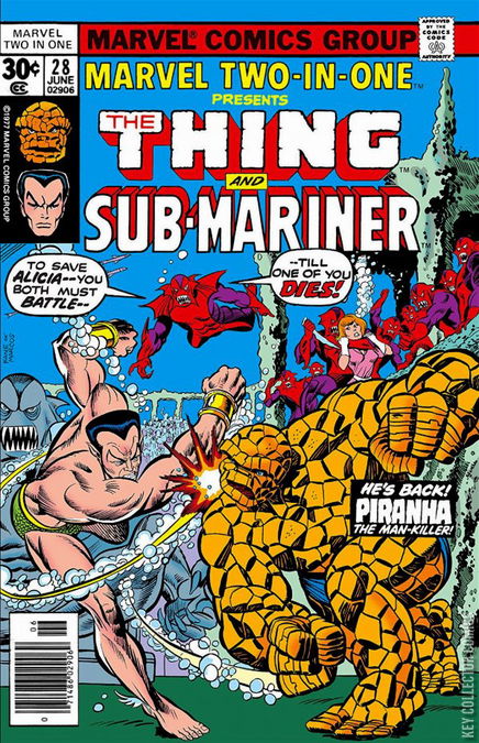 Ben and the rest of the Fantastic Four, with Nick Fury, are in one of Reed's labs examining Deathlok. Reed comes to the conclusion that the Fixer's mind control device (from last issue) cannot be removed without killing Deathlok, and if they don't remove it, he'll die anyway. Reed believes, however, that a scientist (Prof. Louis Kort) in England might be able to help him, so Ben loads Deathlok in a jet for England, and takes Alicia along as well for a vacation.Elsewhere, Prince Namor, the Sub-mariner, is returning home after having been a slave to Dr. Doom. He's ambushed by an old villain from the pages of his own magazine, the Piranha, but quickly kills him dead. Continuing on, he sees Ben's jet passing over. He flies up to greet Ben, but as he does so he's attacked by the Piranha, again. At Alicia's urging, Ben sets the jet down on the ocean surface, and bails out to help. As soon as he leaves, Alicia is kidnapped by.. the Piranha! Ben clobbers him, and returns to the surface for air. As he does so, Namor is attacked (and overcome) by another dozen of the Piranha. When Subby doesn't arrive, Ben heads back down, and he too falls beneath the large horde.Ben and Namor come to in a large arena, filled with hundreds of the Piranha. They're told that they will fight to the death, or else the Piranha(s) will kill Alicia...