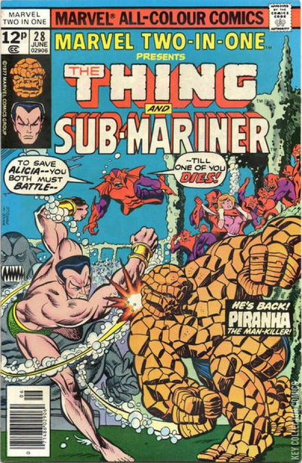 Ben and the rest of the Fantastic Four, with Nick Fury, are in one of Reed's labs examining Deathlok. Reed comes to the conclusion that the Fixer's mind control device (from last issue) cannot be removed without killing Deathlok, and if they don't remove it, he'll die anyway. Reed believes, however, that a scientist (Prof. Louis Kort) in England might be able to help him, so Ben loads Deathlok in a jet for England, and takes Alicia along as well for a vacation.Elsewhere, Prince Namor, the Sub-mariner, is returning home after having been a slave to Dr. Doom. He's ambushed by an old villain from the pages of his own magazine, the Piranha, but quickly kills him dead. Continuing on, he sees Ben's jet passing over. He flies up to greet Ben, but as he does so he's attacked by the Piranha, again. At Alicia's urging, Ben sets the jet down on the ocean surface, and bails out to help. As soon as he leaves, Alicia is kidnapped by.. the Piranha! Ben clobbers him, and returns to the surface for air. As he does so, Namor is attacked (and overcome) by another dozen of the Piranha. When Subby doesn't arrive, Ben heads back down, and he too falls beneath the large horde.Ben and Namor come to in a large arena, filled with hundreds of the Piranha. They're told that they will fight to the death, or else the Piranha(s) will kill Alicia...