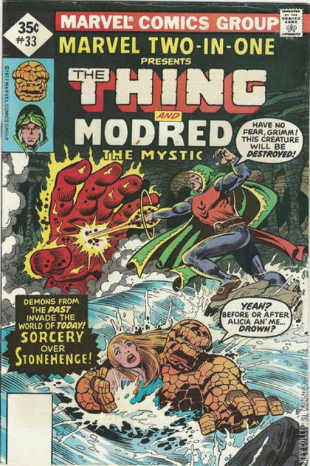 Ben and Alicia are engaged in a passionate smooch after the unhappy events of the last several issues, everything being mostly back to normal. Ben wants to head back to North America, but Alicia is determined to finish her vacation and visit Stonehenge. The two are soon piled into the car and on their way out into the country. Stonehenge is completely unpopulated today, despite the full parking lot. Very shortly, however, four elemental demons appear, and threaten them, saying that they (Ben and Alicia) are two more outsiders for the demons to capture even though neither is the one Merlin has ordered them to seek. In any case, a fight breaks out, and we soon discover that Spider-Woman is here as well, having followed Ben and Alicia out to Stonehenge. In very short order, Ben and Spider-Woman are teleported into an underground cave, and the fight continues there, only stopping long enough for the demons to tell us that they were originally conjured by Merlin to seek a renegade apprentice of his, one that awoke only this year. Ben and Spider-Woman fight on, until a Thor-speaking guy in a cloak shows up and identifies himself as Modred the Mystic, the one whom the demons are seeking...