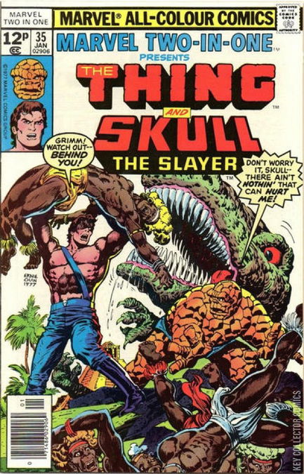 Returning from his vacation in London, Ben heads for Cape Canaveral, Florida, where he's been asked by an old army buddy to to test fly a new experimental jet, while at the same time look for signs of a lost Cobalt Bomb. His jet is grabbed by an exceedingly large pterodactyl, which carries it (and Ben) across some prehistoric land.Cut to four Americans (Skull the Slayer and his three compatriots) strapped to a pillar in a old temple and held captive by the Jaguar Priest. While they recap for us how they came to be brought to this same land (also lost in a jet over the Bermuda Triangle), the Jaguar Priest tries to get the secret of Skull's belt of strength from him. The pterodactyl flies up (the Jaguar Priest claims it as "his pet"), and deposits the jet. A very confused Ben Grimm emerges, and, after being attacked by some of the Jaguar Priest's minions, levels the Temple, freeing Skull and his companions. The five escape, fighting more minions and an unfriendly dinosaur, but soon realize that Ben's jet in unflyable and they all seem to be stuck here, wherever here is...