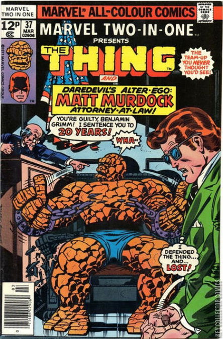 Ben's crashed on his bed reading a horror novel and feeling vaguely self-pitying when he suddenly feels a mysterious sting which causes him to lash out. Puzzled and annoyed, he gets up and heads out. Outside, on the city streets, he soon feels the same sting, and lashes out uncontrollably in the same way, causing major property damage. This happens about three or four more times, and Ben soon finds himself alone in the middle of a devastated street. A local shopowner demands his arrest, and Ben finds himself taken to the local precinct station, where he's fingerprinted, he gets mug shots, and he goes through a police line-up. A couple hours later, a morose and resigned Ben is met by his lawyer, Matt Murdock, also known as Daredevil...The trial didn't go as expected and Thing was considered guilt, when another strange sting causes a new rampage at him. Matt Murdock also senses the sting and decides to investigate it.