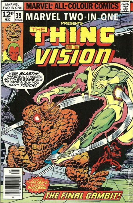 The (Mad) Thinker has Daredevil strapped to a table, and Ben trapped in a locked room thats filling with deadly gas. The Thinker believes that Daredevil has precognitive abilities, and is demanding Daredevil demonstrate them or he'll kill Ben. Daredevil cleverly tells the Thinker that there's a gas leak and they'll all die, and while the Thinker ponders that bluff, Daredevil's hyper-senses let him learn that there's someone about to enter the room, and he quickly tells the Thinker that as 'proof' of his precognitive powers. The 'someone' turns out to be a kid who followed Ben and DD when Ben broke out of jail, and the Thinker quickly locks the kid up. Meanwhile, the Thinker pumps out the gas and frees Ben, but when the Thing predictably tries to clobber the Thinker, the Thinker is prepared and hypnotizes Ben.With Ben under his control and the kid as a hostage, the Thinker frees Daredevil and sends him and Ben, with pre-prepared weaponry, off to capture his ultimate target: the Vision. The Thinker has determined that only the Vision and Yellowjacket will be present in Avengers Mansion, and has set up a way that he can monitor DD through Ben at all times..