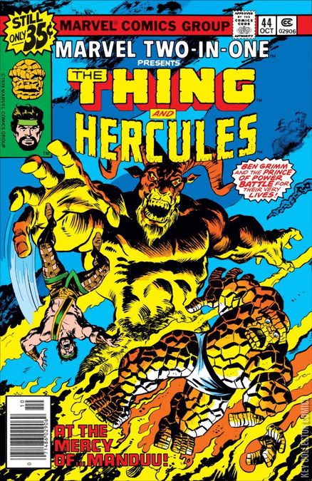 Bashful Benjy is at Camp Run-A-Mok, having been stuck with the lovely duty of visiting and entertaining the kids. As seems to be usual with Ben and kids, they seem to be getting the better of him. To keep 'em under control, Ben tells them a "real-fer-honest-and-true story."The story starts with Ben in the Baxter Building, working out. The Human Torch comes home and picks a fight, which ends with Ben's weights melted. With nothing else to do, he takes a walk, only to be shanghied by Hercules, who has been flying the streets of New York City in a chariot being pulled by a pegasus, looking for Ben. Not giving the Thing a chance to say 'no', Hercules literally lifts him off the street and flies them to Mount Olympus. It seems a race of giants from afar have invaded Mount Olympus and taken over, and Hercules needs Ben's help. The two land where the first of the three giants lives, and Ben bashes them an entrance in...