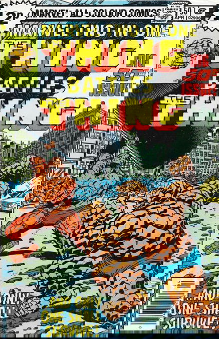 ...And Only One Shall Survive! Ben and Reed (Mr. Fantastic) are in the lab at the Baxter Building, where once again Reed is trying to cure Ben. Once again he fails, this time with a twist. It seems Ben's system is adapting and evolving over time, and though Reed has a cure, it would only have worked back when Ben first became the Thing. It wouldn't work now.Reed leaves, and Ben suddenly has an idea- since it would have worked earlier, why not drink it earlier? Ben hops into Dr. Doom's time machine, sets the controls for not long after the F.F. formed, and heads back in time, intending to have the earlier version of himself take the cure. He ends up in an empty Baxter Building, and slips out just as an earlier Reed and a realtor enter the building to have a look arouns.Inside Ben's old apartment, the old, dinosaur-hided Thing sits and sulks. Outside, on the street, our Ben surprises a couple, and the woman shrieks and faints. While our Thing tries to help her, the old Ben emerges to see a 'monster' looming over the fallen woman. The fight is soon on...