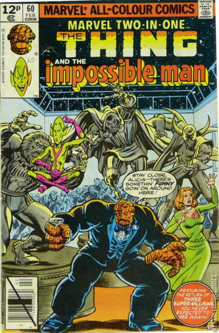 Ben is at home working out and indulging in a little self-reflection when Mr. Fantastic gives him a little push to get him up and motivated to get ready for an opening of his girlfriend Alicia Masters' art show. His preparations are interrupted by the Impossible Man, who succeeds in driving Ben to no end of distraction. Ben finally agrees to let Impy come along (disguised as Ben's hat).The trip to pick up Alicia and get to the function is pretty innocuous for Ben, though the Impossible Man seems to have a lot of fun, and the fete is soon in full swing.Things are interrupted when three mystics looking for vengeance against Ben use their abilities to activate three of Alicia's life-sized statues. They all attack Ben, who is unable to defend himself for fear of destroying Alicia's work...