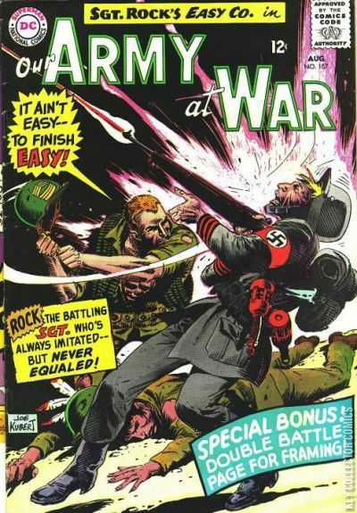 Cover art by Joe Kubert. Nothin's Ever Lost In War starring Sgt Rock, script by Bob Kanigher, art by Joe Kubert. Spotter on the Spot, script by Hank Chapman, art by Irv Novick. A"double battle page for framing."
