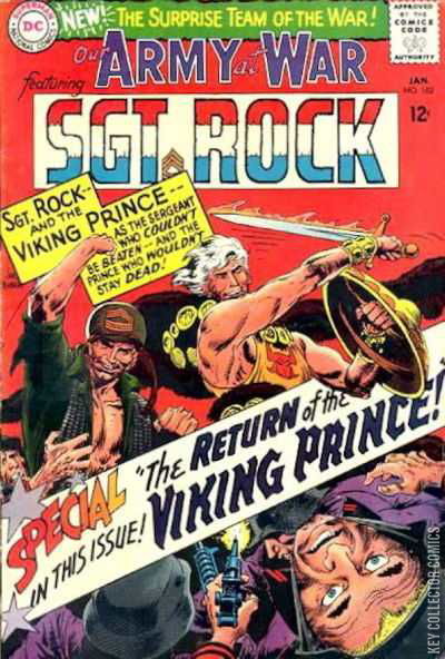 Cover by Joe Kubert."The Prince and the Sergeant!" written by Robert Kanigher, penciled and inked by Joe Kubert, colored and lettered by Unknown."Dirty Little War!" written by Hank Chapman, penciled and inked by Gene Colan, colored and lettered by Unknown.Notes: The Viking Prince story is reprinted in Sgt. Rock Special #1, The Viking Prince by Joe Kubert & Showcase Presents: Sgt. Rock #3. The first appearance of the Viking Prince since The Brave and the Bold #24.