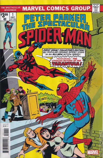 TWICE STRINGS THE TARANTULA! Spider-Man is on the campus of Empire State University to snap photos of Vice-Chancellor Edward Lansky who is making a hard line against proposed budget cuts to the education system from the mayor's office. Although he is bored out of his mind, Spider-Man believes that Lansky is a straight up guy. Suddenly, the international terrorist known as the Tarantula leaps into the middle of the press conference. Spider-Man leaps into action to prevent the kidnapping of Lansky. However, on his way to the ground, he can't help but notice that Mary Jane Watson with Flash Thompson, hurt that the pair has been seeing each other lately. While Spider-Man is busy fighting the Tarantula, his minions make off with Lansky. Seeing this, Flash Thompson tries to stop them, only to be easily knocked aside by the masked kidnappers. Spider-Man fails to stop the Tarantula and his goons manage to escape. Stunned by his foe's final blows, Spider-Man has to make a hasty retreat when the students and faculty accuse him of being in league with the Tarantula. Going up to the rooftops, Spider-Man goes to recover his camera only to discover that the webbing holding it in place snapped, wrecking the camera and destroying the photos he took. Angered over his constant bad luck, the wall-crawler punches the side of the building, hurting his hand. Returning home, Peter changes back into his civilian guise before he returns to his apartment. As he crosses the hall he is greeted by his neighbor Glory Grant, who sees his injured knuckles and offers to patch him up. He learns that Glory's modeling career isn't going so well and she has decided to go look for a regular job. As they leave, they bump into Mary Jane, who invites herself along with them to city hall to job hunt. When they arrive, Peter spots the same limo that was used by the Tarantula to capture Lansky. With an excuse about needing to visit his Aunt May in hospital, Peter leaves his companions and slips into a washroom to change into Spider-Man. Outside, the Tarantula's employer orders him and his minions to eliminate the mayor. When they attempt to use the mayor's private elevator they are attacked by Spider-Man. While the wall-crawler is busy with the Tarantula's minions, the villain makes his way up to the mayor's office. Before the Tarantula can eliminate the mayor, Spider-Man leaps in to stop him. Their fight sends Spider-Man, the Tarantula, and the mayor crashing out of a window to the streets below. Spider-Man forces the Tarantula away, so he can rescue the mayor. Although he has failed to stop Spider-Man, the Tarantula vows to get revenge. When the mayor asks if the Tarantula returns, Spider-Man promises that he will be there if he does and leaves to catch up with Glory and Mary Jane.