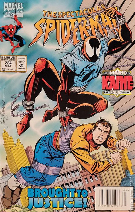 THE ASSASSIN WITH FACE! Thinking he was Peter Parker, the man who emerged from a cloning chamber in one of the Jackal's labs only days earlier suddenly begins to transform into a freakish creature. This is before the eyes of the real Peter Parker, his wife Mary Jane, Kaine and the Scarlet Spider. Kaine tells the couple that this creature was created to be a weapon by the Jackal and vows to the Parkers that he will destroy this creature in order to keep them safe. This is when the Scarlet Spider breaks free from Kaine's grasp, having played possum to find out what's going on. He tells Peter and Mary Jane to run to safety while he handles both Kaine and this new Parker clone. Not liking leaving Ben alone to face these maniacs alone, Peter leaves in order to keep his wife safe. Meanwhile, the Peter Parker clone attacks Kaine and the Scarlet Spider. He is still convinced that he is the real Peter Parker and that he will be restored to normal after destroying the Jackal's enemies. The Scarlet Spider briefly considers this as a possibility but refuses to believe that Peter Parker would be capable of committing murder. Despite the fact that Kaine is his greatest foe, the Scarlet Spider realizes that he has to fight with him. At that moment, along the shore of Ryker's Island, Judas Traveller and Scrier stand watch. Traveler has created an illusion to trick the guards into being unaware that Peter Parker has broken out of prison. Traveler assisted Parker's escape so he could save his wife and unborn child. Judas is curious to see if Peter will return to prison after he has succeeded in his task. Back in the sewers, Peter and Mary Jane continue to flee from the battle. The tide turns when Kaine uses the Scarlet Spider to distract the Parker clone long enough to rip down the ceiling upon their attacker. The Spider is furious that Kaine would try to kill their foe, however, Kaine reminds him that this shouldn't surprise Reilly given his past history. However, his efforts to kill the clone fails as it increases in mass to free itself. By this point, Peter and Mary Jane have gotten to the surface. There, Mary Jane cannot ignore the fact that her husband wants to go back and help Ben and tells him that he isn't taking her any further. Meanwhile, Kaine is restrained by the Spider-Clone that Ben has started calling "Freakface", but the Scarlet Spider manages to pull him free. He tells Kaine that they need to go somewhere that will give them more room to fight. While back on the surface, Mary Jane explains that despite the fact she hates that Peter constantly risks his lives for others, she knows that this is fundamentally who he is and she can't help but love him for it. She insists that he leave her to go and help Ben, assuring Peter that she can make it home fine on her own. She tells him to come back alive, reminding him that they have a firm date on living happily ever after. By this time, the Scarlet Spider and Kaine surface at a construction site where they are followed by Freakface. There, Peter Parker arrives and begins launching steel girders at the clone using a sling-shot made out of webbing. However, the clone refuses to give up without a fight and tosses a car at Peter, but he dodges out of the way. While the Scarlet Spider is worried about the risks Peter is taking, Freakface lifts up a propane truck. Before the clone can throw it, Kaine throws a car at the propane truck causing a massive explosion. Peter managed to get clear of the blast. As he fears for the fate of Ben, Kaine walks out of the flames, filling him with dread. However, Kaine turns around and walks away through the flames. Scanning the wreckage, Peter spots the Scarlet Spider's hand sticking out of the rubble. He pulls Ben out and tells him that Kaine has fled. When Ben suggests they should leave, Peter gets upset that he has to go back to Ryker's for a crime he didn't commit. When he accuses Ben of committing the crime, Ben says that it is a lie and to prove his innocents agree to take Peter's place in prison so Parker can be with his wife and unborn child. As Peter makes his decision, they are unaware that they are being watched from the rooftops by Kaine. Later that evening, it is Ben Reilly who returns to Ryker's Island, unobserved by all except for Judas Traveler and Scrier. Judas is unsurprised by this turn of events and tells Scrier that the greatest test of Peter Parker's sense of responsibility is still to come.