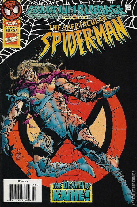 MAXIMUM CLONAGE PART 5 - IF DEATH BE MY DESTINY! Ben Reilly has just recently learned that he was the original Peter Parker. Upon learning that he was a clone and living a lie for five years, the man now known as Peter Parker ended up joining with the Jackal. Trying to find Peter, Ben has found himself battling an army of Spider-Clones alongside the imperfect clone known as Kaine. The Scarlet Spider is disturbed by Kaine's willingness to kill the Spider-Clones, pointing out that they are victims of the Jackal as they are. As they continue to fight, Ben wonders where the Peter Parker he came to find. Meanwhile, at the Parker home, Mary Jane tries to make sense of everything that has happened. All she wants is for her husband to come home as they have a baby on the way. In order to try and coax Peter to return home, she activates all of his spider-tracers all at once. Elsewhere, Spider-Man is swinging across the city with the clone of Gwen Stacy in his arms. When Mary Jane activates the spider-tracers it his spider-sense to go off painfully. He almost drops himself and Gwen to the ground but manages to stop his fall by clinging to the side of a nearby building. When Gwen asks what happened, Peter explains that his wife must have activated all his spider-tracers. Hearing this, Gwen is surprised to hear that Peter is married and insists that they go and help her. While at his lab, the Jackal is still trying to figure out how the man named Rafael Carago survived being exposed to his new and improved Carrion Virus. This comes as an upset to the clone known as Spidercide because he wants to destroy the Scarlet Spider and Kaine. Unfortunately, the Jackal has determined that this is a paltry concern if his virus is not 100% effective. Back at the scene of the battle, the Scarlet Spider is still struggling to come to terms with the revelation that he is the real Peter Parker as he battles the Spider-Clones. Suddenly, the clones begin to degrade and melt into genetic soup on the floor. Kaine wants to speed up the process by killing the clones that are still standing. Reilly tries to convince Kaine to stop committing cold-blooded murder. He then decides to try and talk sense into the clones, begging them to join him in his fight against the Jackal. By this time, Spider-Man arrives back at his home with the Gwen Stacy clone. At first, Mary Jane mistakes her for the real Gwen Stacy, but still treats it this situation as a long-awaited reunion. When Gwen tells Mary Jane how happy she has see that she and Peter are finally together. This causes Mary Jane to wonder what kind of future the pair have going onward. Back at the Jackal's hideout, the battle between the Scarlet Spider, Kaine, and the clones has landed in the middle of the Jackal's main lab. With Spidercide nowhere around, the Jackal decides to flee the scene, but his escape is spotted by Kaine. While at the headquarters of the New Warriors, the team watches a news report about the Scarlet Spider and wonder who he is. When Turbo complains about there are two Spider-Men, her teammate Speedball points out how ironic her statements on. THeir conversation is interrupted by their leader, Justice, who tells them that the survivor of the Springville slaughter has been captured. He orders everyone to mobilize that they are going to search for the Jackal's innocent victim. Meanwhile, the Jackal finds Spidercide in one of his computer rooms transmitting the Carrion Virus data to Scrier. When the Jackal attempts to activate the kill switch implanted in Spidercide's mind, he discovers that it has been deactivated by Scrier. When Spidercide attempts to kill his creator, he is ambushed by Kaine, who wants Miles Warren for himself. Back in the lab, the Scarlet Spider continues to try and convince the Spider-Clones that they can have normal lives. Removing one of their masks, Ben is horrified to see that these imperfect clones aren't even fully human. When they all begin to melt before him, he becomes ill. He is able to hold his own against Spidercide until he is struck by another precognitive flash of Mary Jane getting killed. This time he sees who the killer is and cannot believe it. This distracts him long enough for Spidercide to impale Kaine through the chest. This is seen by the Scarlet Spider who is horrified that Spidercide committed murder. As the two fight it out, the Jackal goes to Kaine's side and asks his creation why he risked his life. Kaine tells the Jackal that he did so because the mad scientist was responsible for giving him life. As Kaine apparently dies in his arms, the Jackal finds this pathetic. Eyeing one of his cloning canisters and decides not to let this genetic material to go to waste. Meanwhile, the Scarlet Spider knocks Spidercide into one of the electronic devices. This causes an explosion that frees Helix, who flees the scene. The blast pins the Scarlet Spider's leg under equipment, allowing Spidercide to escape. The Jackal finds Ben Reilly and tells him that he has to go as he learned that there are other players in this game. However, he doesn't want to leave the Scarlet Spider alone and at the snap of a finger the genetic soup on the floor suddenly merges into a single entity that begins trying to smother the Spider.