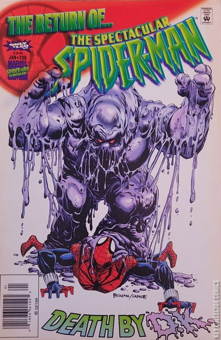 BROTHER'S KEEPER David and Henry Kalen, brothers and environmental consultants, are on the outskirts of Green Lawn, Long Island, are leaving the Sanders Chemical Corporation's main processing plant. Their investigation has discovered that the owner of the company has been operation in violation of new environmental standards and Henry figures he can get them shut down. That's when they pass by a small lake filled with barrels of toxic waste. Horrified by this brazen disregard for the environment, the two brothers stop for a closer look. Pulling one of the barrels out of the water, both David and Henry discover that it has been rigged with a bomb that suddenly goes off as the container is disturbed cutting both men down in the blast. In Manhattan, Spider-Man is swinging across the city feeling fully liberated now that he has reclaimed his costume identity once again. After testing out his new batch of webbing his spider-sense warns him of danger just as furniture is hurled through the windows of a nearby office building. Swinging into the building, Spider-Man is shocked to discover some kind of muck-monster terrorizing the people inside the office. The creature, calling itself D.K. is demanding that the people in the office produce their employer, Mister Saunders. When the wall-crawler tries to web up this monstrosity, his webbing dissolves harmlessly against its chemically based body. D.K. tells Spider-Man that he has no issue with the masked hero and then grabs the door jamb on the other side of the room. This causes a chemical reactions that makes the ceiling begin to melt. Fearing the harm this goop may cause the innocent people all around, Spider-Man begins webbing it back up to the ceiling, allowing D.K. to make his escape. Spider-Man is not looking forward to spending his day off hunting this monster. At that very moment, at the Daily Grind, Shirley Washington is trying to talk to her son Devon about his chores and homework assignments, but Devon is too focused on a television program that he doesn't hear a word that she is saying. By this time, Spider-Man has learned that D.K. was attacking the corporate office of Sanders Chemical Corporation and learns that the owner of the company is at their main plant on Long Island. The wall-crawler races there in the hopes that he can get there before the monstrosity that is after Sanders. Sure enough, Spider-Man gets there first and stakes the place out. He spots Sanders in one of the windows and notes that the business owner is pacing around nervously. He also can't help but notice how thick the air is will pollution, although he figures that tight environmental regulations ensure that the company is running within acceptable levels. Suddenly, Spider-Man's spider-sense kicks in and focuses in a nondescript man walking through the main gate. This is not the creature he has been looking for, but he decides to move in to keep a closer eye on Sanders. From his new vantage point Spider-Man witnesses as D.K. comes crashing into Sanders' office. As the muck monster closes in for revenge, Spider-Man leaps through the window and tries to tackle the abomination. Unfortunately, the wall-crawler passes harmlessly through the goop that comprises of D.K.'s body. Once again, the monstrosity warns Spider-Man to say out of its affairs. Making itself solid again, D.K. batters the wall-crawler and then returns his attention to Sanders. He tells the corrupt business owner that he will pay for his crimes against humanity and nature. Afraid for his life, Sanders tries to strike the creature with a metal pipe, but it dissolves upon contact with D.K.'s body. Hearing the commotion, the plant's security force prepares to storm Sanders' office, but the steps leading up to it suddenly dissolve. Back upstairs, D.K. finally has Sanders at his mercy so the creature reverts to human form revealing itself to be David Kalen. Kalen reveals that the bomb killed his brother, but turned him into something more. Pulling himself back together, David vowed to tear down the Sanders chemical empire. After confronting the killer Sanders fired, Kalen was able to gather a great deal of damaging evidence that proves Sanders hired the hit on David and his brother as well as his illegal dumping operations. While David is explaining everything, Spider-Man pulls himself out of the rubble and ambushes David. Pulling the tortured man outside, the wall-crawler webs him up to a flag pole. He tells Kalen that the damning evidence is enough to put Sanders away for a long time and that he doesn't have to resort to murder. David, in tears, tells Spider-Man that it is not enough, telling the web-spinner that Sanders is also responsible for the death of his brother, Henry. Spotting Sanders trying to make an escape, David turns back into D.K. and slips through Spider-Man's webbing. However, when he tries to dissolve the getaway car with Sanders in it, Spider-Man swoops in and rescues D.K.'s would-be victim. This infuriates the muck-monster who vows to kill Sanders even if he has to go through the wall-crawler to do it. thinking that Kalen won't kill an innocent man, Spider-Man calls his bluff and stands between the environmental horror and the crooked businessman. Although D.K. charges at Spider-Man, he quickly begins to lose his nerve and stops his charge, reverting back to human form. David agrees to do things Spider-Man's way and soon Sanders is taken away by the police. After the crisis is over, Spider-Man then puts in a call to Ravencroft Institute. Soon, John Jameson and Edward Wheland arrive on the scene to pick up D.K. for treatment and to help him regain his lost humanity.