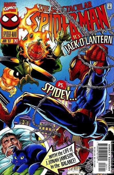 MAD JACK After being beaten by Jack O'Lantern, J. Jonah Jameson has been hospitalized and in a coma. By her husband's bedside, Marla Jason is assured by Doctor Filmore that Jonah is going to be fine and that he needs time to heal. When she asks who could have done such a thing to her husband, Doctor Filmore doesn't have any answers for her. Once alone, Marla is relieved when Jonah wakes up and is in good spirits despite having been seriously beaten. They are soon joined by Jonah's son John and his employer Doctor Ashley Kafka. When John asks his father who beat him, Jonah insists that he doesn't remember who attacked him and tells his son to let the police handle the matter. Overhearing this from outside is Spider-Man who can't help but feel sorry for the newspaper publisher. Although Jameson has been a constant source of aggravation for Spider-Man, he gave Peter Parker a job as a photographer when he needed the money in high school. Climbing up to the roof, Spider-Man tries to think who might be going after Jonah this time when he is suddenly struck by a feeling of vertigo and manages to prevent himself from falling off the roof. That's when his spider-sense goes off. He spots the source, the villain known as Jack O'Lantern. Wondering why the villain is hovering around the hospital, he can't help but think it has something to do with Jameson's beating. When the wall-crawler confronts Jack about what's going on, he admits to nothing and sicks his cat Maguire on the hero. While the web-spinner struggles to get the cat off his face, Jack flies around and comes up on Spider-Man from behind. Then, to demonstrate that he is much different than his predecessor, Jack pulls his pumpkin head off his shoulders and holds it out to the hero. The pumpkin suddenly explodes, knocking Spider-Man down to a nearby rooftop. With a new head in place, insisting that Spider-Man call him Mad Jack, the villain tells Spider-Man that he has a bone to pick with the Jamesons and warns the hero to stay out of his affairs. As the villain departs, Spider-Man tries to go after him but has to stop as another feeling of vertigo strikes. While at Empire State University, Mary Jane is unable to focus on her classes because she is still trying to process her recent encounter with the Chameleon. She has come to realize that when she used to enjoy the fact that she was involved with Peter Parker and his life as Spider-Man. However, now their marriage is starting to become as chaotic as her own parent's marriage. he wonders how much more chaos she can handle and thinks that the recent loss of her baby must have forced her to grow up a little. She thinks about how she has to find some kind of stability and this is why she decided to go back to school. It's then that her thoughts are interrupted by her professor, who has noticed that Mary Jane has grown distracted. When she is unable to answer his question, she is told to pay more attention. When class is over, Mary Jane is embarrassed by the whole ordeal, but her friend Jill Stacy tells her not to worry about it as everyone has an off day. They briefly run into Peter, Mary Jane's husband, who can't stay because he is running late for his tutoring session and takes off. At the Daily Bugle, Betty Brant is caught off guard by an unexpected visit from Flash Thompson. Flash explains that he called in sick to work so he could come to the Bugle and thank her for being there when he was depressed. However, Betty is too busy to listen to Flash as she has a deadline due and tells him to call her later. When Joe Robertson comes with her with more pressing work, Flash feels rejected and walks out before Betty has a chance to say anything. While at a dinner in Lower Manhattan, Marla Jameson has lunch with her stepson John and Ashley Kafka. She is happy to hear that the pair have started a relationship but she can't get her mind off what happened to her husband. Their discussion is interrupted when they notice that there is a cat under their table and that it is being very friendly to John. Unaware that this is Jack O'Lantern's cat Maguire, nobody notices John enter a hypnotic trance but are confused when John tells them that he has personal business to deal with and abruptly leaves. Incidentally, Flash Thompson is in the same dinner and has gotten drunk after being rejected by Betty. Chatting up a woman named Phantasy Applebaum, Flash invites the woman back to his apartment to see his old high school football trophies. Meanwhile, Spider-Man has come to get answers from J. Jonah Jameson. However, the newspaper publisher is unhappy to see the wall-crawler and is too busy berating the web-slinger instead of giving him any answers. Quickly realizing that he is going nowhere, Spider-Man leaves Jonah's hospital room and is glad that he was at least able to cheer Jonah up a little. Wondering his next move, Spider-Man lucks out when Mad Jack returns to the hospital. During the ensuing battle, Spider-Man is shocked when his fist sinks into Mad Jack's head as though it were a real pumpkin. To his horror, Spider-Man struggles with his sanity when Jack's head grows in size and swallows him. Quickly deducing that this is some kind of illusion or hallucination, Spider-Man fights free of it, much to Mad Jack's amazement. Falling to the ground, Spider-Man prepares to fire a web-line when another wave of vertigo strikes him. Surprisingly, Jack saves the wall-crawler's life, telling Spider-Man that he has no beef with the hero and that his appearance here was only a distraction. Once Jack has flown off, Spider-Man realizes that Jonah is in trouble and heads back to the hospital. There he stops someone trying to smother Jonah with a pillow. Knocking the attacker aside and turning on the lights, Spider-Man is shocked to discover that Jonah's would be assassin is his own son, John.