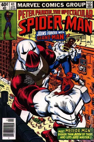 METEOR MADNESS! Having missed a deadline for one of his papers, Spider-Man swings to the campus of Empire State University. In order to get his paper in, he sneaks into the administration building and into the office of Professor Slattery, who is marking papers. Taking caution so as not to be seen, Spider-Man manages to lower his paper onto the pile. As he is exiting the building, Spider-Man hears sirens and follows campus security to the ESU coliseum where an exhibition devoted to microwave energy is on display. When campus security attempts to stop the man who broke in they are easily tossed back outside. Inside the building, Spider-Man's old foe the Meteor Man has come to look for components that he believes that he can use to boost his power. Before he can loot the facility, he is attacked by Spider-Man. Although the wall-crawler had the element of surprise, the Meteor Man manages to smash the hero with a microwave transmitter. News of the battle spreads across the ESU campus, interrupting a guest lecture being given by biochemist Bill Foster. While everyone runs for cover, Bill slips away so he can change into his alter-ego, Giant-Man. When Giant-Man arrives at the scene, Spider-Man is failing to convince Meteor Man to surrender and get help. The Meteor Man tosses Spider-Man into Giant-Man, knocking them both down. Giant-Man recovers first and tries to attack the Meteor Man, but he underestimates his strength and is tossed outside. Meteor Man then makes his escape in with his hot-air balloon. However, before he gets away, Spider-Man manages to tag him with a spider-tracer. With the battle over, Spider-Man and Giant-Man exchange pleasantries, the pair agree to work together to capture the Meteor Man. They discover blueprints for some kind of transmitter the Meteor Man is attempting to build. With a crowd gathering outside, the two masked heroes leap over the crowd so they can begin their search. Meanwhile, the Meteor Man returns to his lab in Hell's Kitchen where he has already gathered a number of meteors. He recounts how he, Norton Fester, was affected by the gasses from a meteor he found gave him his powers. However, this led to a series of defeats of Spider-Man and heroes like the Defenders. Fester puts this all behind him as he believes his luck is about to change. By this point, Spider-Man has locked onto his tracer and leads Giant-Man to the Meteor Man's hideout. They arrive to late to stop Meteor Man from building the microwave transmitter to siphon power from his meteor collection to increase his power. As the two heroes try and stop their foe, the energies from the meteors cause the Meteor Man to begin to grow in size. Spider-Man tries to destroy the machine, but its energies are too powerful. He goes outside to help Giant-Man, who has been overpowered by a gigantic Meteor Man. Spider-Man breaks Giant-Man free and saves his life. However, he fails to stop the Meteor Man from siphoning too much power from the meteors. With his microwave transmitter overloading, he tries to escape by flying away only to explode. Although the battle is over and Fester was a madman, Giant-Man remarks that nobody should die like that.