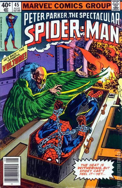 WINGS OF FIRE, WINGS OF FEAR The Vulture is attempting to take control of New York's mobs with the help of his nephew Malachi. To this end, they have managed to capture Spider-Man, who was then chained up and placed in a coffin that is to be incinerated in a crematory furnace. Still groggy from the gasses that put him in this situation, Spider-Man cannot muster the strength to break free. However, once he the concealing portrait closes behind him, Spider-Man manages to gather enough strength to leap out of the coffin and safely away from the flames. However, his leap knocked the coffin askew, leaving it to catch on fire and fill the cremation chamber to start filling with smoke. Outside, the Vulture and his minions celebrate the apparent demise of Spider-Man, Black Alfred arrives with the statue that the Vulture asked stolen. The Vulture takes the statue and reveals that he was aware that Alfred had been eliminating the competition, playing right into the Vulture's hand. The two come to blows when suddenly, Spider-Man comes smashing through the room with flames following behind him. With the building catching fire, the Vulture flees the scene with his nephew. Meanwhile, the other mobsters decide to take advantage of Spider-Man's compromised position. However, by this point, Spider-Man has regained his full strength he manages to break free taking the fight out of the mobsters. With the room quickly becoming an inferno, they beg Spider-Man to save their lives. Spider-Man smashes a hole in the ceiling and uses a web line to carry the men up to the main floor. With the sound of fire trucks approaching, Spider-Man webs up the mobsters so they can the authorities can take them into custody. While outside, the Vulture and Malachi have managed to get out of the burning building. However, they have been followed by Black Alfred who is itching for revenge. He tries to shoot the Vulture, but Malachi takes the bullet for his uncle. Seeing his last surviving relative getting gunned down puts the Vulture into a fury and he attacks Black Alfred. Before he can kill the mobster, Spider-Man arrives and the two come to blows. While they fight, the police arrive on the scene and arrest Black Alfred who surrenders in order to get protection from the Vulture. Meanwhile, the flying villain tries to escape, but Spider-Man manages to snag his leg with a web-line. Their battle takes them across the rooftops until they eventually come crashing through the front window of Grand Central Terminal. There their battle continues, but they are interrupted by arriving police officers. The Vulture tries to make his escape but ends up slamming into an ultra-hard glass barrier, knocking himself out. Defeated, and mourning the loss of his nephew, the Vulture surrenders without any further conflict. Later at the offices of the Daily Globe, Barney Bushkin has heard about Spider-Man's battle with the Vulture and asks Peter Parker if he managed to get photos. Sullen by the Vulture's tragic defeat, Peter tells Barney he didn't get any photos. Unaware that Peter is upset, Barney cheerfully tells him that you can't get them all.