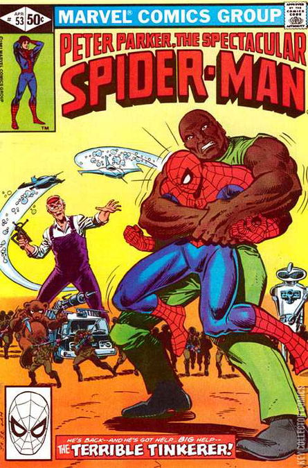 TOYS OF THE TERRIBLE TINKERER Peter Parker is walking back from a series of photo shoots that ended with his camera being broken. His thoughts are interrupted when he spots a woman trying to jump from an office building. The police are trying to talk her into coming down, but the woman is hysterical and rants about people taking the toys away. Deciding to get involved, Peter has no time to change into Spider-Man and slips into a nearby phone booth. He is spotted by the man responsible for the woman's episode above and he dismisses Parker as a reporter phoning in a story. Inside the phone booth, Peter puts on his web-shooters and uses his webbing to cover his face so he can go into action. Meanwhile above, the woman is afraid to go near the officer trying to talk her down because, in her mind, he appears to be a menacing toy soldier. Just as the officer grabs her arm, the ledge breaks sending both falling over the edge. Spider-Man swings in tries to catch them in his webbing. Unfortunately, their fall causes the webbing to snap, so the wall-crawler leaps down and gets a foothold on a flagpole and grabs them. However, they pull free from Spider-Man's grasp. The hero manages to save them, but he uses his webbing to create a net to catch them. With the disaster over, the man responsible slips away, cursing Spider-Man's interference. Peter decides to investigate what caused the woman to jump and climbs into the office building, a savings and loan company. Inside, he sees that someone blew the safe open. His spider-sense warns him that whoever is responsible is still inside. Suddenly, a toy zeppelin flies into his field of view and blasts him with a blinding light. Spider-Man is then grabbed by a massive man who has great strength. Breaking free and fighting back, the wall-crawler recognizes his attacker as the Tinkerer's assistant, Toy. During the fight, Spider-Man is distracted by a toy jack-in-the-box that sprays gas into his face. This stuns him long enough for Toy to knock him out. Toy then takes the stolen loot and jumps out the window. When Spider-Man gets himself together he spots Toy flying away thanks to a helicopter rotor that springs from his backpack. The wall-crawler tosses a spider-tracer at his foe, and it attaches to the back of Toy's head. The fact that Toy doesn't seem to register it puzzles the web-slinger. Before he can figure it out, the police arrive in the room, prompting Spider-Man to make an escape. On the rooftops, Peter realizes that he has to wait for his makeshift web-mask to dissolve before he can go anywhere. 45 minutes later, the webbing dissolves and Peter changes into his Spider-Man costume. He then tracks the spider-tracer to a fix-it shop. Sneaking inside, the wall-crawler finds the Tinkerer's secret workshop. After looking around for a bit, his spider-sense warns him that the Tinkerer is returning and he hides on the ceiling. When the Tinkerer and Toy enter the room, the villain boasts about his thefts, which have become a necessity because his prices for super-villain tech got to be too high. That's when Spider-Man swoops in and attacks Toy. The Tinkerer is furious as Spider-Man has interfered in yet another one of his plots. Spider-Man is confused because as he has only fought the Tinkerer twice before. However, the Tinkerer explains how he was one responsible for setting his Spider-Mobile against the wall-crawler, and that he was involved in the feud between the Rocket Racer and Big Wheel. The Tinkerer then activates all of his deadly toys and they begin attacking the wall-crawler. Trying to get away, he ends up landing in a massive claw game. Spider-Man leaps to safety, but is grabbed by Toy. When the Tinkerer tries to shoot Spider-Man with his weapon, the hero tosses Toy into the path of the blaster. The shot blows Toy open, revealing him to be a machine. Seeing his only companion destroyed breaks the Tinkerer's mind and taking the fight right out of him. Spider-Man is at a loss to explain how someone who would treat life so cheaply could have such a connection to an unliving machine.