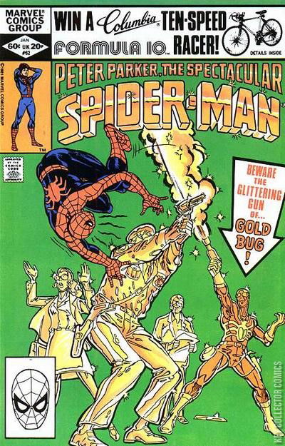 GOLD FEVER! The villain Goldbug is trying to get membership in the Maggia, however, the representatives he is speaking with wish him to prove his worth to them. The decide that to send him to ESU to steal gold that is currently being experimented on. As the gold is being transported to the ESU science wing, Peter Parker takes some photos of the event as Spider-Man, before changing to his civilian identity and meeting up with his colleagues. Peter's new friendship with Marcy Kane causes Debra to worry and reconsider her feelings for Peter. As Peter and Dr. Sloan experiment on the gold with radiation, Goldbug arrives to steal it. During the theft, Goldbug uses his gold gun to turn two security guards and Debra into gold statues. Peter tags Goldbug's escaping ship with a spider-tracer before creating a solution to dissolve the gold trapping Debra and the others. Knowing the gold is dangerous due to its radioactivity, Peter goes after the Goldbug as Spider-Man. He traces it to a warehouse hideout of the Maggia, where he gets locked in a fight with the Maggia and Goldbug. During the fight, Spider-Man manages to remove Goldbug's gloves to show that they have suffered radiation burns. Furious that Goldbug could be so stupid, the Maggia try to kill him along with Spider-Man. Spider-Man manages to jump out of the way of the bullets, but apparently, Goldbug is gunned down and sinks to the bottom of the river due to his gold costume and seemingly drowns. When Spider-Man surfaces, he notices that the fight has brought the police who are rounding up the Maggia members and recovering the stolen gold. With his job complete, Spider-Man quietly swims away from the scene.