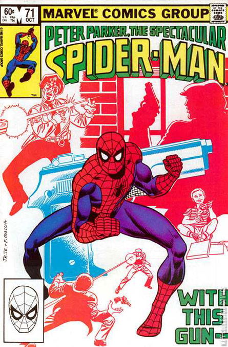 WITH THIS GUN... I THEE KILL! When two kids try to rob a grocery with illegal guns, Spider-Man is there to try and stop them, however, the shop owner is also armed and shoots one of the thieves dead. Later when turning over pictures to the Bugle, Peter hears J. Jonah Jameson talking about a tip-off of a shipment of illegal weapons. Peter goes into action as Spider-Man and tries to stop the shipment, however, a police officer is killed in the line of duty in spite of Spider-Man helping stop the operation. When Peter goes to turn in his pictures to the Bugle, he's a little more than disgusted by Lance Bannon's suggestion that Peter should get a Pulitzer, and considers that the widow of the officer killed will only be getting a posthumous medal. It's a bitter victory for stopping gun crime, as Jameson comes in and tells them that even though there was this huge bust, there were still 12 reported shootings in the city that night.