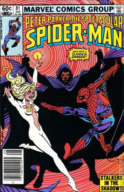 STALKERS IN THE SHADOWS At Dannemora State Prison, the guards mock Boomerang's vow to break out of prison as they are returning the prisoner to his cell after supper. Boomerang has, however, palmed a spoon which he uses as a makeshift boomerang to disable to the locks to his and the Punisher's cells. As the guards come and investigate the alarm that rings as a result, the Punisher waits with his cell door pulled – closed, but not locked – and when they are preoccupied with Boomerang gets the jump on them. The pair steal the uniforms off the unconscious men and flee to the top of the outer wall of the prison where they set up a rope of tied clothing to carry them out to safety. With the prison guards catching up with them, the Punisher betrays Boomerang by knocking him down into the waiting arms of the guards and escapes by himself vowing to kill the Kingpin. While in New York City, Peter Parker is walking out of his apartment when he spots his landlady Mrs. Muggins attacked by druggies looking to score some easy money. Peter jumps in and scares them off, but when he realizes they were trying to stick her up for drug money, he begins to contemplate the city's drug problems and wishes there was more he could do. He walks off to the bus stand, unaware that Cloak and Dagger have witnessed the entire the scene. Catching up with the drug addicts, the vigilante duo attack them, and using their powers, clean their systems of the drug and its addictions before vanishing as quickly as they appeared. However, before the rehabilitated group can enjoy their new lives clean from drugs, the Punisher jumps down and murders them all for having taken drugs in the first place. Peter arrives at the Columbia Presbyterian Hospital where he tests out the police security that is protecting the Black Cat in her period of convalescence, recovering from her injuries. Finding the safety measures satisfactory, he changes into his Spider-Man uniform and greets Captain DeWolff and is granted permission to visit Felicia. Finding her still asleep, he kisses her and then contemplates what future they have together before leaving the hospital out the window. As Spider-Man swings through the city, he muses over his recent encounter with an unknown automaton assailant, and his contemplations over quitting school. His thoughts are cut off when his spider-sense goes off leading him to a condemned, abandoned building. There he finds a bunch of dead junkies. When he's approached by Cloak and Dagger, Spider-Man assumes incorrectly that they had murdered the junkies and attacks them. Left with no choice, Cloak uses his powers to pull Spider-Man into the Darkforce Dimension within his cape. Ejecting him out of the dark void within him, Cloak and Dagger then show Spider-Man the truth: The junkies were shot down with a hale of mercy bullets and that the man who did it came to find out who sold them the drugs before leaving. Elsewhere in the city, the Punisher is out to kill the man responsible for the drug proliferation in the city: The Kingpin.