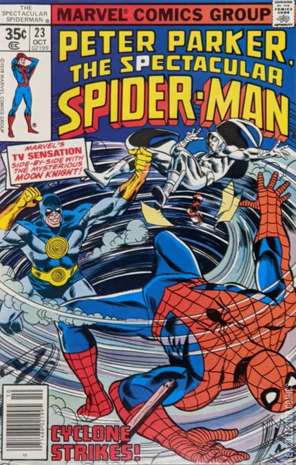 GUESS WHO'S BURIED IN GRANT'S TOMB! Battling the Cyclone, Spider-Man and Moon Knight are unable to stop the Cyclone to kill their only lead to the Maggia crime organization. After Cyclone gets away, Moon Knight finds a brochure in the young man's pocket for Grants Tomb. He then asks Spider-Man for his help in trying to capture the Maggia's leader, a task which Spider-Man agrees to help with.�� Meanwhile, Hector Ayala gets into an argument with his sister, Holly Gillis tries to get a hold of Hector, and speaking of telephone tag, Mary Jane tries to call Peter Parker, and Betty Brant tries to call her husband Ned in Paris, all to no avail.�� Meanwhile, Moon Knight takes Spider-Man to his headquarters, the mansion he occupied in his identity of Steven Grant. There he shows Spider-Man all he knows about the Maggia organization, and the two plan to crash the revealing of their leader at Grants tomb. That night they drop in on the Maggia members just as their leader is about to emerge from Grant's Tomb, however, due to Spider-Man and Moon Knights interference, the leader (secretly the Masked Marauder) decides to flee the scene instead of revealing himself.�� While Spider-Man and Moon Knight fail to capture the leader of the Maggia, they manage to capture all who are present there including Cyclone.