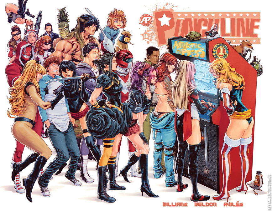 Punchline X Ninja High School X RAGS X Kamen America X Black HOPS X Tomorrow Girl & much much more!! The danger gets outta hand real quick, so everyone has to come together hastily in order to take down this jumbo threat! Whether you're a stand-up or sit-down reader, this limited wraparound variant cover's gonna look good in your cabinet. So plunk down those quarters to score a copy now, so you won't have to console yourself later!