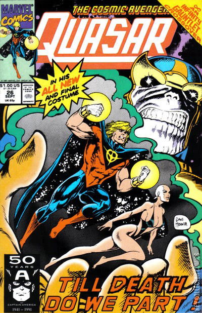 Quasar deals with the aftermath of Cosmos In Collision. He encounters the Mourners who conduct Eon's funeral. Thanos, with the Infinity Gauntlet, attacks, reanimates four previous Quantum-Band wielders, and causes Eon's remains to spill out onto Earth.