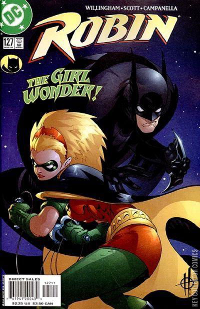 GIRL WONDER Stephanie Brown is officially working as Robin. She and Batman keep the streets constantly clean from crime. Working together, they learn about a war between the mafia families Aquista and Galante. Meanwhile, Tim Drake tries to contact Stephanie, but he's unable to locate her. At that moment, Scarab reports that she has already eliminated the eighth Robin candidate and his family as well. She is not stopping until she finds the real Robin now that word on the street is that Robin is back in action. Another night, Batman and Robin fight against a villain named Tiger Moth. They are unable to land a hit on her and Robin finally captures her by sheer luck and a dumb accident, while Batman rescues the kidnapped kids Moth had taken. Back in the Batcave, Batman analyzes Tiger Moth's suit and discovers a secret device that disrupted their coordination, making them fail all their attacks. Batman deduces that Moth was part of the mafia war. At school, Tim prevents a bully from hurting a nerd, much to Darla Aquista's pleasure. Bernard Down joins them and shows them the newspaper headlines about a female Robin. Bernard explains his theories about a mysterious orphanage owned by Batman, where he gets his Robins, but Tim knows truth of the situation and realizes Bruce has been preventing him from talking to his girlfriend. Stephanie is training in the Batcave under Oracle's supervision until the telephone rings and Stephanie answers, thinking it is Batman. However, from the other side comes Tim's voice and they finally decide that they need to talk about the situation. Batman is on his way to the Batcave. Knowing that Tim and Steph just decided to meet he calls Cass and tells her he needs her to do something special. Batman arrives at the Batcave just before Stephanie could go out as Robin and prevents her from going anywhere without him. Batman explains that they must look for the serial killer who has been murdering young men between 14 and 18 years old and their respective families. After showing pictures of the victims, Stephanie realizes that they are all similar looking to Tim and they deduce that the killer is going after the previous Robin. Meanwhile, Tim waits for Stephanie on his rooftop, but instead, Batgirl shows up with the purported purpose of talking to Tim though he quickly deduces that she's there as a guard and to keep him and Stephanie from talking on Bruce's orders. Scarab is on her way to the ninth victim's place and she is surprised by Batman and Robin, who are already inside the home, waiting for her.