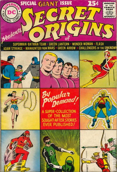 THE ORIGIN OF THE SUPERMAN-BATMAN TEAM! When Luthor escapes from prison again, Batman and Robin are reminded of their earliest case together with Superman. They rush to Metropolis in the event that Luthor intends to use kryptonite against Superman again. When Batman and Robin summon Superman to work out their collaborative attack to stop Luthor, they are surprised to see Superman arrive with Powerman. Superman unexpectedly claims that Powerman is his new partner and that Batman and Robin are no longer needed. he surprise move does not deter Batman and Robin from continuing their investigation against Luthor, though not directly with Superman. Batman and Robin devise an effective defence against Luthor's latest invention - a destructive ray that cannot penetrate silicon. With their shields the subdue Luthor and confiscate the kryptonite he intended to use in a ploy against Superman. With the threat of Luthor removed, Superman revealed to his friends that Powerman was a remote-controlled robot he designed to safeguard them from harm, and deal with Luthor is he attempted to use kryptonite to eliminate Superman. SECRET OF THE ETERNAL CITY! Adam Strange is an archaeologist working in the country of Caramanga in South America. A tribe of hostile Incan villagers begin chasing Adam, but he manages to elude them when his body is struck by a strange beam of energy. This energy ray, known as a Zeta-Beam instantly teleports Adam Strange twenty-five trillion miles through space to the planet of Rann. There, he meets the scientist Sardath. Sardath explains that the Zeta-Beam was initially a communication ray, but radiation altered it, transforming it into a teleportation beam. Adam learns that once the Zeta-Beam radiation wears off, he will be instantly teleported back to his point of origin. Adam spends a great deal of time with Sardath, and meets his daughter, Alanna. He learns the Rannian language, as well as a portion of Rann's violent history. Some time later, a race of alien invaders known as the Eternals arrives on Rann in search of a rare mineral known as Vitatron. Adam Strange and Alanna journey to the city-state of Kamorak where they encounter the Eternals. Alanna believes that Vitatron can only be found in the mythical city of Samakand - a place that only appears once every twenty-five Rannian years. Adam and Alanna go to Samakand and consult with some of the scientists within the city. They manage to bait the Eternals into following them, and the scientists use their advanced technology to trap the invaders inside of a fourth-dimensional prison. A short time later, the Zeta-Beam radiation infecting Adam's body wears off, and he instantly teleports back to Earth. However, he has already developed a fondness for the alien world and it's denizens and wishes to return. Adam knows that the Zeta-Beam will strike the Earth again, so he begins calculating the exact location at which the beam will strike. THE PLANET OF THE DOOMED MEN! While out testing a new aircraft, Hal's astral form is transported to the world of the Guardians, who seek to know who took over the role of Green Lantern in that sector of space from Abin Sur. Hal recounts the events that led to him becoming the Green Lantern. Convinced that Hal is worthy of the title, they erase his memory and return his astral form to his physical body, deciding that now is not the time for Hal to know of their existence. Returning to his dressing room at the Ferris Aircraft Company, Hal gets a message from his Power Battery asking him to defend the beings on the planet Calor. Traveling out that way, Hal finds a race of primitive humanoids being terrorized by a monstrous creature that can fire mental bolts of energy. As he battles the creature, it's a race against time as the 24 hour deadline for his power ring's charge looms. Hal uses his power ring to freeze the creature in ice and places it in a glacier where it will not thaw out. Hal returns to Earth with just enough time before his power ring loses its charge. THE SECRET OF THE SORCERER'S BOX! En route by plane to appear on the radio program "Heroes", Olympic wrestling champion Rocky Davis, master skin diver Prof Haley, circus daredevil Red Ryan and War hero and jet pilot Ace Morgan are caught in a storm and their plane crashes. Surviving the crash, the group agrees that they are living on borrowed time and that they should work together challenging the unknown as the Challengers of the Unknown. After making headlines with their exploits, the Challengers are invited by the mysterious Mr. Morelian who offers them a million dollars if they succeed in opening Pandroa's box. Taking the box out to an uninhabited island, each member tries opening the box. Unleashing and stopping such terrors as a giant stone warrior, a miniature sun and a whirling weaver, the Challengers defeat each challenge presented to them. After Morelian appears informing them that he knew of the dangers in the box, and that he set the Challengers to unleash them so that he can get the true prize of the box: a ring of immortality. However, when Morelian tries to fly away, his plane crashes and dies, the ring having been a dud. The Challengers leave the island, wondering where their next adventure will take them. THE SECRET ORIGIN OF WONDER WOMAN Shortly after the birth of Diana, daughter of Queen Hippolyta, Paradise Island is visited by Aphrodite the Goddess of Love, who comes to wish the young Diana well, and tells the infant girl that she will grow to be the fairest maid in all the land. The baby would be visited also by Athena, who would give her wisdom, Mercury who would be amazed at the tot's speed, as well as Hercules who is impressed by the girl's strength. Time passes, and eventually conflict would claim the lives of all the men of Amazonia and the women would be in utter woe. Seeking to escape the conflict of the mainland, Queen Hippolyta would rally the rest of the Amazons and announce that they would be leaving, to e