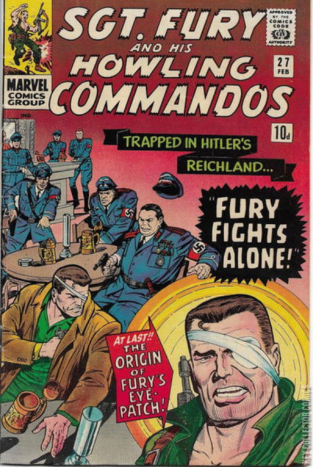 Trapped behind Nazi lines, Fury's left eye is injured when a grenade explodes too close to it. He rejects an operation that would preserve its vision; such surgery would keep him out of action for a full year at just the time when the Howlers need him most.His eye heals, but he is now guaranteed one day to lose its vision. (This happens in 1964.)