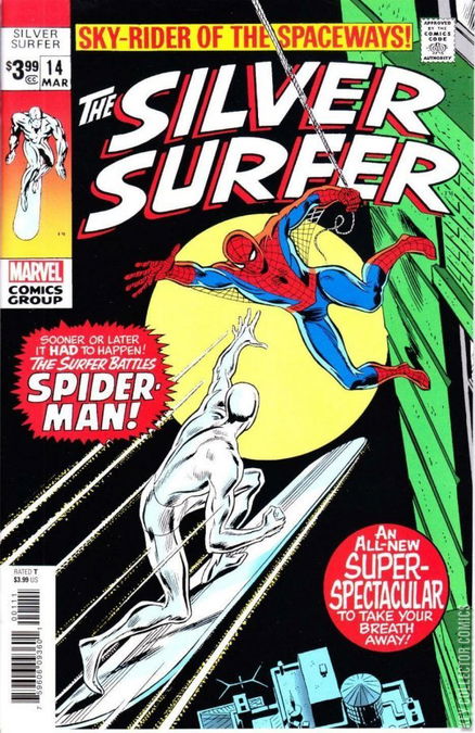 The Silver Surfer saves the Earth once again when two meteors are about to collide above the Earth. He stops it from happening but is sent plummeting toward the planet.He travels to the surface above New York City. As he is flying, Spider-Man accidentally webs to the Surfer's board. Spider-Man wants him to bring him down but the Surfer does not trust him. Spider-Man uses his web to make the Surfer fall from his board. But the board follows to save the Surfer from the fall, pulling Spider-Man with it.The Surfer cuts his web but saves him from his fall as well. A boy sees the Surfer pass his window and travels to the roof to watch. Spider-Man finds the Surfer and through misunderstanding, they begin to fight.The US Army begins evacuating the area where they battle. They fire on the Surfer, who calls his board. He does not know that the boy is standing on it though. He uses all of his strength to protect the boy while taking all the explosions from the army. The Surfer is weakened but may have finally gotten what he has always wanted, humans to no longer view him as a menace. The Army and Spider-Man realize that the Surfer is no menace, but a hero. Note: This is the first meeting between Spider-Man and The Silver Surfer.
