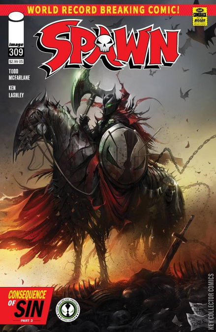 "CONSEQUENCE OF SIN" Part One TODD McFARLANE and KEN LASHLEY continue to expand the SPAWN Universe. With the future in doubt and Medieval Spawn's legacy in question, Spawn, She-Spawn, and Reaper go on the offensive. But a long-time ally has shown his true colors, and Cogliostro rallies an army and a deadly new recruit...GUNSLINGER SPAWN.