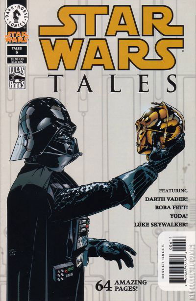 Where can you find an encounter between Yoda and a probe droid on Dagobah, the chance meeting of C-3PO and Darth Vader on Cloud City, and a cannonball by Boba Fett into the Sarlacc on Tatooine? In the many pages of Star Wars Tales #6, the ultimate quarterly romp through a galaxy far, far away ! This stellar issue features a Yoda story by Sean Konot and Scott Morse, a haunting tale of Darth Vader and C-3PO by Ryder Windham and Kilian Plunkett, a gritty yarn showcasing Greedo by Jim Pascoe, Tom Fassbender, and Eric Powell, plus many others!