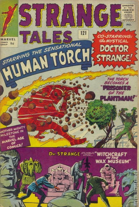 The Human Torch has the power to create the heat and light of a supernova. So how is it that Plantman is able to douse his flame with nothing but the dew of acorns? Is it something to do with the Plantman's nocturnal visit to the Human Torch's house, when he threw a bucket of water over him - or shall we put this tale down to one of Stan's off days? We have to rely on the Doctor Strange story to salvage this issue, as the Master of Mystic arts encounters "Witchcraft in the Wax Museum." Can the good Doctor use his powers to overcome the evil that lurks therein? Another tale of mystery wrought by Stan and Steve.