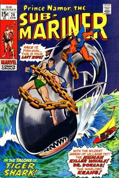 The Human Killer Whale on one side -- the treacherous Tiger Shark on the other! Can either Namor or sunken Atlantis escape total destruction?