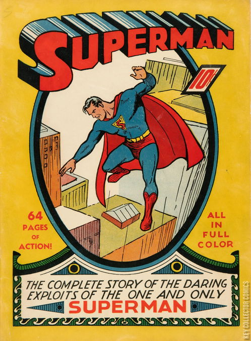 CLARK KENT GETS A JOB The doomed planet Krypton was about to explode. A scientist on it placed his infant son in a rocket-ship that eventually landed on Earth. It was found by John & Mary Kent, who turned the baby over to an orphanage. His feats of strength were already apparent, and they were all too ready to give him back to the Kents when they showed up and asked to adopt him. After the death of his parents, Clark Kent, the boy's human name, tried to get a job at the Daily Star, but was turned down because of his lack of experience. Hearing about a riot at the county jail, he heads over there to try to prove his worth. After dispatching the mob that is trying to kill a prisoner, the prisoner gives him some information. It seems that Bea Carroll, singer at the Hilow Night Club, killed Jack Kennedy and framed Evelyn Curry for the murder. He tells Daily Star editor George Taylor what he knows about the riot, and Taylor hires him on the spot. THE COMING OF SUPERMAN Superman travels to the Hilow Night Club and tells Bea Carroll that he knows that she killed Jack Kennedy. What follows is a retelling of the story from Action Comics #1, "Superman, Champion of the Oppressed". REVOLUTION IN SAN MONTE This story is reprinted from Action Comics #2. THE BLAKELY MINE DISASTER This story is reprinted from Action Comics #3. SUPERMAN, GRIDIRON HERO This story is reprinted from Action Comics #4.