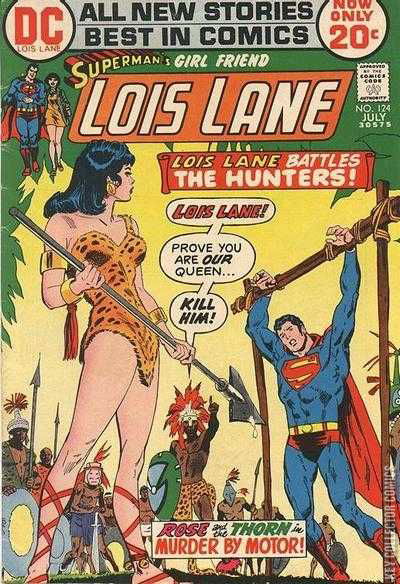 Cover by Bob Oksner."The Hunters" written by Cary Bates, penciled by John Rosenberger and inked by Vince Colletta. (Lois Lane, Superman vs. The 100) The Hunters division of the 100 makes Superman think Lois is a jungle woman."Murder by Motor" written by Cary Bates, penciled by Don Heck and inked by Henry Scarpelli. (Rose and Thorn)"Lois Lane! Prove you are our queen... kill him!"