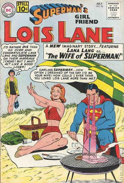 "The Day Superman Married Lana Lang!" (Imaginary Story) -Superman marries Lana and gives his wife super-powers. "Lois Lane's Childhood" -Lois and Kal-El's childhood are paralleled on different worlds, amazingly the future Superman is still able to save Lois's life. "The Mad Woman of Metropolis!" -"Killer" Meigs' men try to convince Lois she is going insane to get revenge for her helping put their boss in prison.
