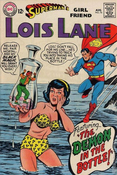 Cover by Wayne Boring and Kurt Schaffenberger."The Demon in the Bottle!" (part 1) "The Double-Crossing Demon!" (part 2) written by Leo Dorfman, penciled and inked by Kurt Schaffenberger. Story continues in the next issue.Vitar: Release me, fair mortal, and my black magic will grant you every wish!"Superman: Lois! Don't fall for his line...he's trying to trick you into taking his place in the bottle!