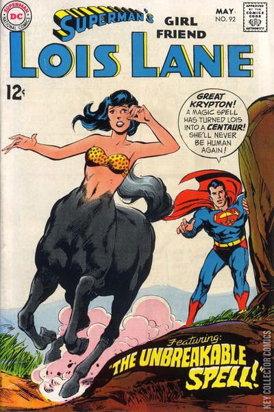 Cover by Curt Swan and Neal Adams."The Unbreakable Spell!" (part 1) "The Chestnut Mare Ain't What She Used to Be!" (part 2) written by E. Nelson Bridwell, penciled by Curt Swan and inked by Mike Esposito."Great Krypton! A magic spell has turned Lois into a centaur! She'll never be human again!"