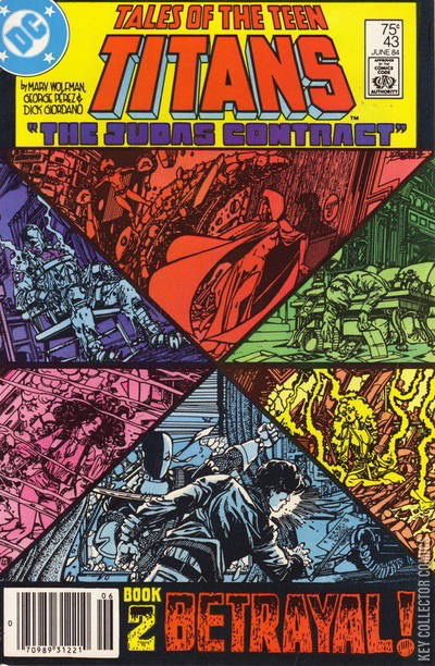 The Titans betrayed! Deathstroke the Terminator attacks Dick Grayson at the teen hero's home. Dick barely escapes, and he's already too late to save his teammates! The only help he now has comes from a mysterious woman and her young son. First appearance of Jericho! "The Judas Contract" part 2. SpoilerDick Grayson is at home typing a letter when suddenly the Terminator crashes through his apartment window and attacks him. It quickly becomes clear that the Terminator knows that Dick was once the retired super-hero Robin, though Grayson has no idea how he could have acquired such knowledge. Realizing that the Terminator has a physical advantage over him, Dick baits his foe into kicking him out the broken window. He uses his leather jacket to slow his fall as his body plummets into a pile of garbage. As the Terminator begins firing rounds out the window, Dick (injured) sprints into the crowd. The Terminator gives chase and follows him across a busy street. Two witnesses to this tableaux are the middle-aged woman who had been spying on the Terminator, and her silent teenage son. Terminator follows Dick into a nearby park, but Dick loses him in a crowd of marathon runners.Fearing that his fellow Titans may be in danger, Dick tries to contact them on his communicator, but nobody responds. He races over to Donna and Kory's apartment, but as he feared, the penthouse is in shambles. He finds evidence of a letter bomb that could've been used to render Kory unconscious. Examining Donna's darkroom, he finds trace elements of poisonous chemicals that had been mixed with her photo solutions. He suspects that the odor from the chemicals would have been strong enough to incapacitate someone of even Donna's hearty constitution.He next stops at Victor Stone's apartment. Breaking down the door, he finds an empty chair outfitted with clamps and wires designed to electrocute its intended target. He also finds a letter on the floor from Vic's grandparents and surmises that he was reading...