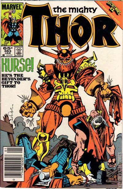 Thor has just returned from Hela's domain, and has to fight and old enemy - Kurse! He's the Beyonder's Gift to Thor! With the help of Power Pack and Beta Ray, Thor defeats him.Then the Beyonder show up and Thor ask him to send Kurse after the one who had really killed him - Malekith.At the end the Beyonder decides to be a hero and vanishes. Then a girl appears running towards Thor and after kissing him, he changes into a frog!!!!!! Another Loki's trick.