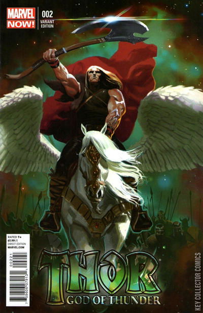 THE GOD BUTCHER, PART TWO: BLOOD IN THE CLOUDS Throughout the ages, the gods of the Marvel Universe have been vanishing, their mortal worshippers left in chaos. NOW! The Mighty Thor follows a trail of blood that threatens to consume his past, present and future selves. The only hope for these ravaged worlds lies with the God of Thunder unraveling the gruesome mystery of the God Butcher!