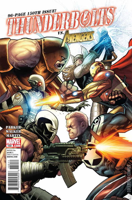 Iron Man, Thor and the original Captain America guest-star in this 96-page 150th blow-out issue! First, in the 40-page lead story, The Thunderbolts reach their milestone as loudly as possible, when the golden figures of the Marvel Universe come to their gray world--none other than the Armored Avenger, the God of Thunder and the Super-Soldier! Thor has come to hold court with one of his people held in the women's wing of The Raft, and when his fellow Avengers join him, things go to a realm no one expected! Iron Man comes face-to-face with Ghost, the man who almost killed him, and Steve Rogers confronts the man who did kill him, Crossbones! Plus: character bios, key reprints and more surprises in the book that has IGN.com exclaiming: "Parker and Walker are injecting a bit of fun and excitement into the title...This is the most consistently enjoyable title with the Heroic Age banner and anyone looking for a great team book would do well to give Thunderbolts a read."