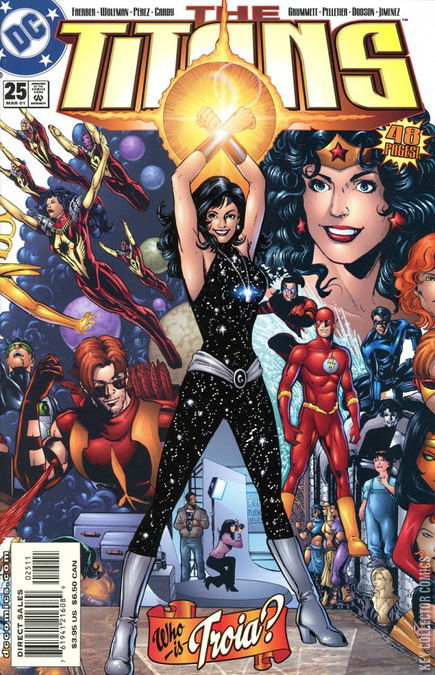 OverviewThe reunion of the New Teen Titans creative team of Marv Wolfman and George Perez highlights this extra-sized issue. Nick Cardy, Phil Jimenez, Tom Grummett and Terry Dodson are also on board to illustrate various chapters, as our team of Titans is joined by the Titanic team from The Kingdom -- travelling through different points in Donna's history before the evil Dark Angel can erase them. If they fail, all existence is in jeopardy.
