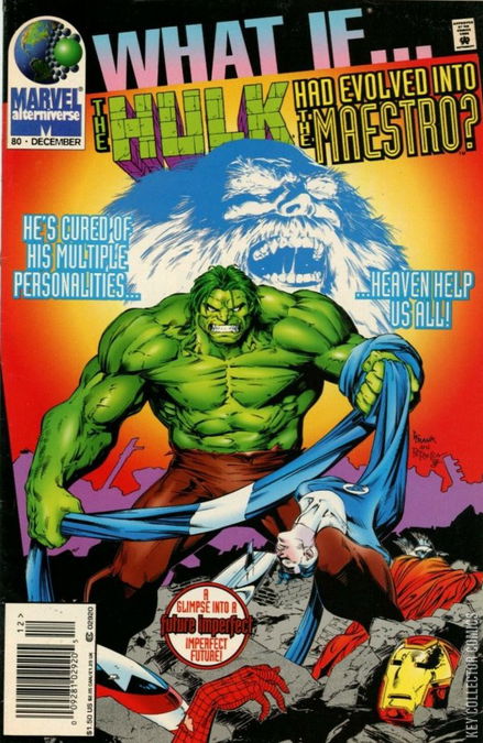 Cover pencils by Gary Frank, inks by Bob Petrecca. What If the Hulk Got Himself Cured?, script by James Felder, pencils by Kerry Gammill and Ed Benes, inks by Bob Petrecca and Mike Halblieb; As the Ringmaster hypnotizes Bruce Banner in order for Doc Samson to integrate his personalities, he pokes fun at his subject and Bruce responds by Hulking out and killing him. As the Hulk begins his transformation into the smart and cruel Maestro, Mr. Fantastic and the Thing try to bring him down. Realizing he is about to turn into an unstoppable monster, Bruce pretends to be in Hulk form as he attacks the Thing who delivers a final blow. 36 pgs. Cover price $1.50.